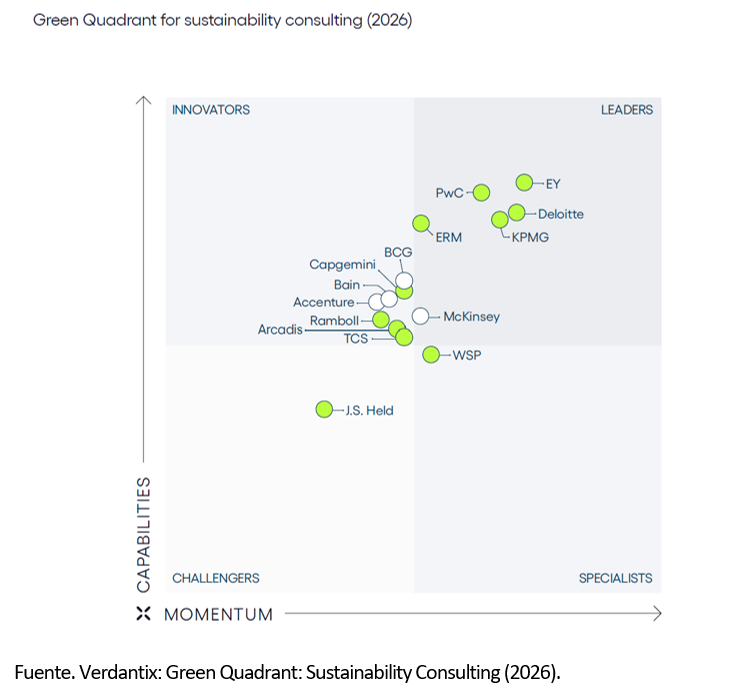 La sostenibilidad ha dejado de ser un concepto abstracto para convertirse en un pilar estratégico de las corporaciones más avanzadas del siglo XXI. EY acaba de recibir un espaldarazo definitivo a su apuesta por la generación de impacto tangible al ser reconocida como la consultora más efectiva en este ámbito por el informe Green Quadrant 2026 de Verdantix. Este hito no solo valida su modelo de negocio, sino que también marca un punto de inflexión en cómo las empresas abordan los desafíos ambientales, sociales y de gobernanza (ESG). En un contexto donde los inversores exigen transparencia y los reguladores endurecen los requisitos, la capacidad de traducir la retórica sostenible en resultados concretos se ha convertido en la nueva moneda de cambio del sector.